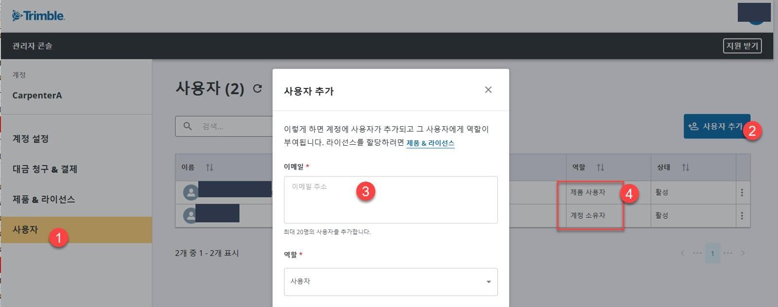 위 그림처럼 로그인 후 1~4번 순서로 클릭하여 사용자를 추가 합니다.