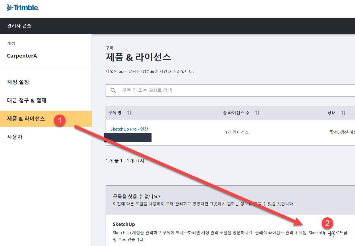 먼저, 스케치업 라이센스 관리를 위해, https://ecom-prd.trimblepaas.com/ecom/portal 에 접속해야 합니다.